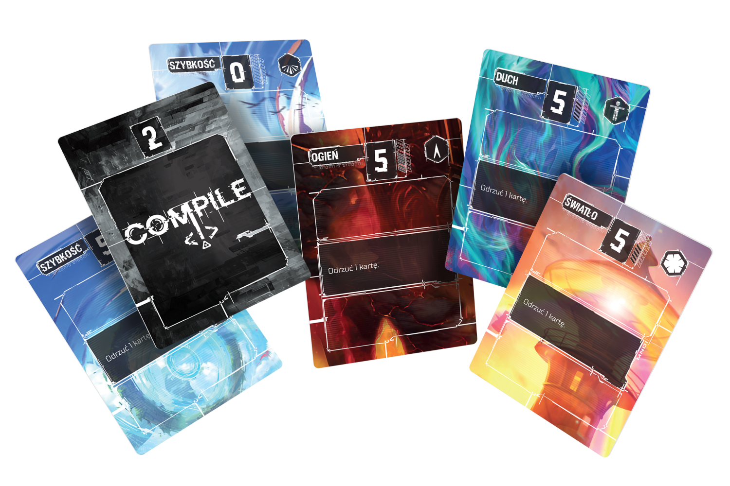 Zestaw zawiera karty do następujących protokołów: ciemność, śmierć, ogień, grawitacja, życie, światło, metal, plaga, umysł, szybkość, duch, woda. UWAGA! Wersja polska obejmuje również rozszerzenie Compile: Aux 1 - Jednostka pomocnicza, zawierające protokoły dodatkowe: miłość, nienawiść, apatia.