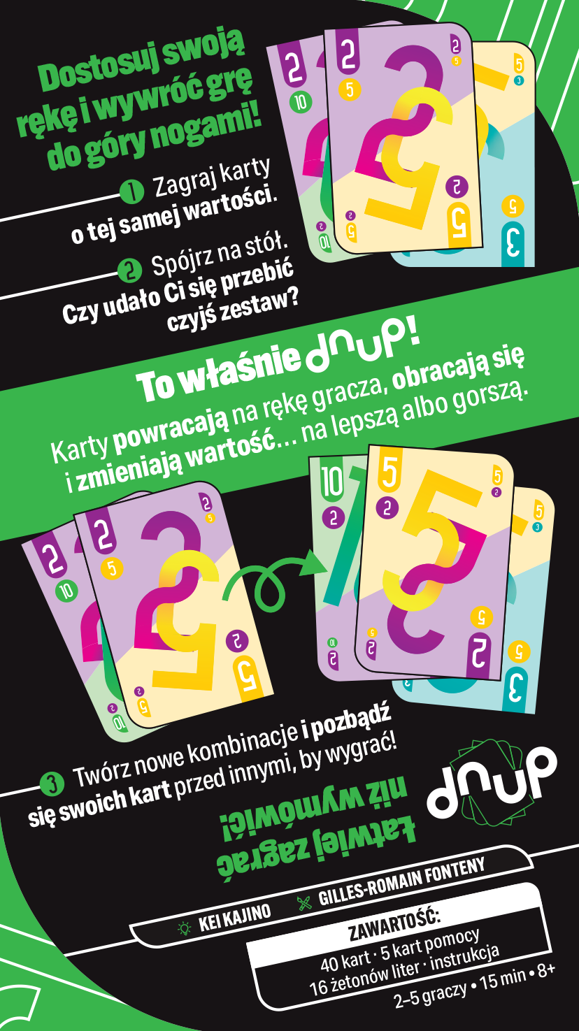 Zarządzaj kartami na ręce, zbieraj zestawy i zagrywaj je, licząc, że żaden z przeciwników nie przebije ich do czasu Twojej następnej tury. Taki właśnie jest dnup – zwariowana gra karciana, w której musisz odnaleźć się w zmiennej sytuacji na stole, by skutecznie pokrzyżować szyki przeciwnikom. Zagraj karty o tej samej wartości. Spójrz na stół. Czy udało Ci się przebić czyjś zestaw? Jeśli tak, to świetnie, bo karty wracają na rękę tej osoby. A przy okazji po drodze… zmieniają swoją wartość!