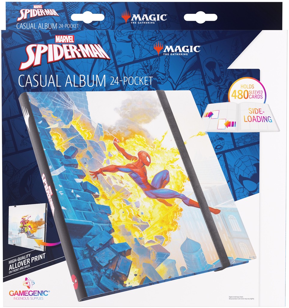 24-Pocket Album - Spider-Man/Green Goblin to wysokiej jakości album, który pomieści do 360 kart. Doświadczeni gracze z pewnością pokochają jego wytrzymałe i wysokiej jakości strony, które pozwalają wygodnie przechowywać karty. Warta docenienia jest również okładka, na której możemy znaleźć piękną ilustrację prosto z gry Magic: The Gathering. Okładka jest niezwykle wytrzymała i zamykana na gumkę, która doskonale utrzymuje zawartość albumu w ryzach.