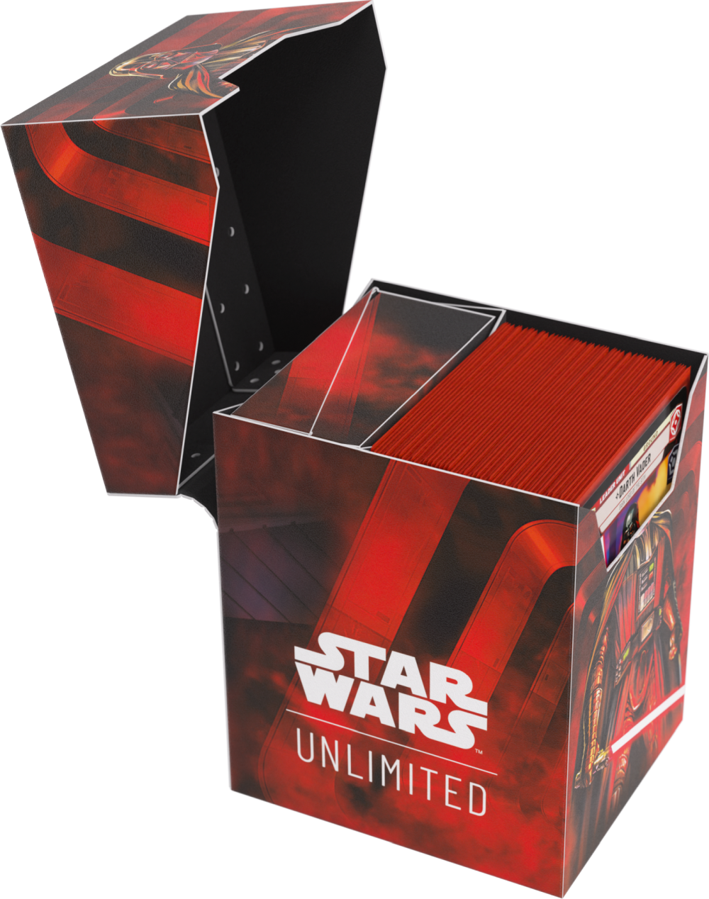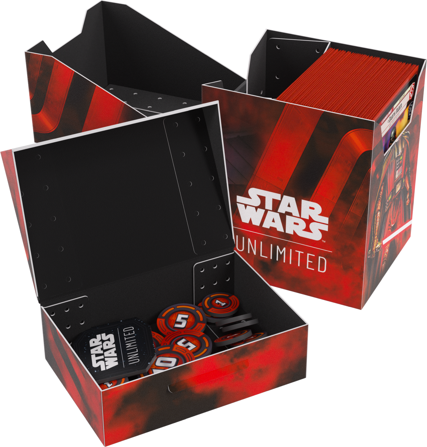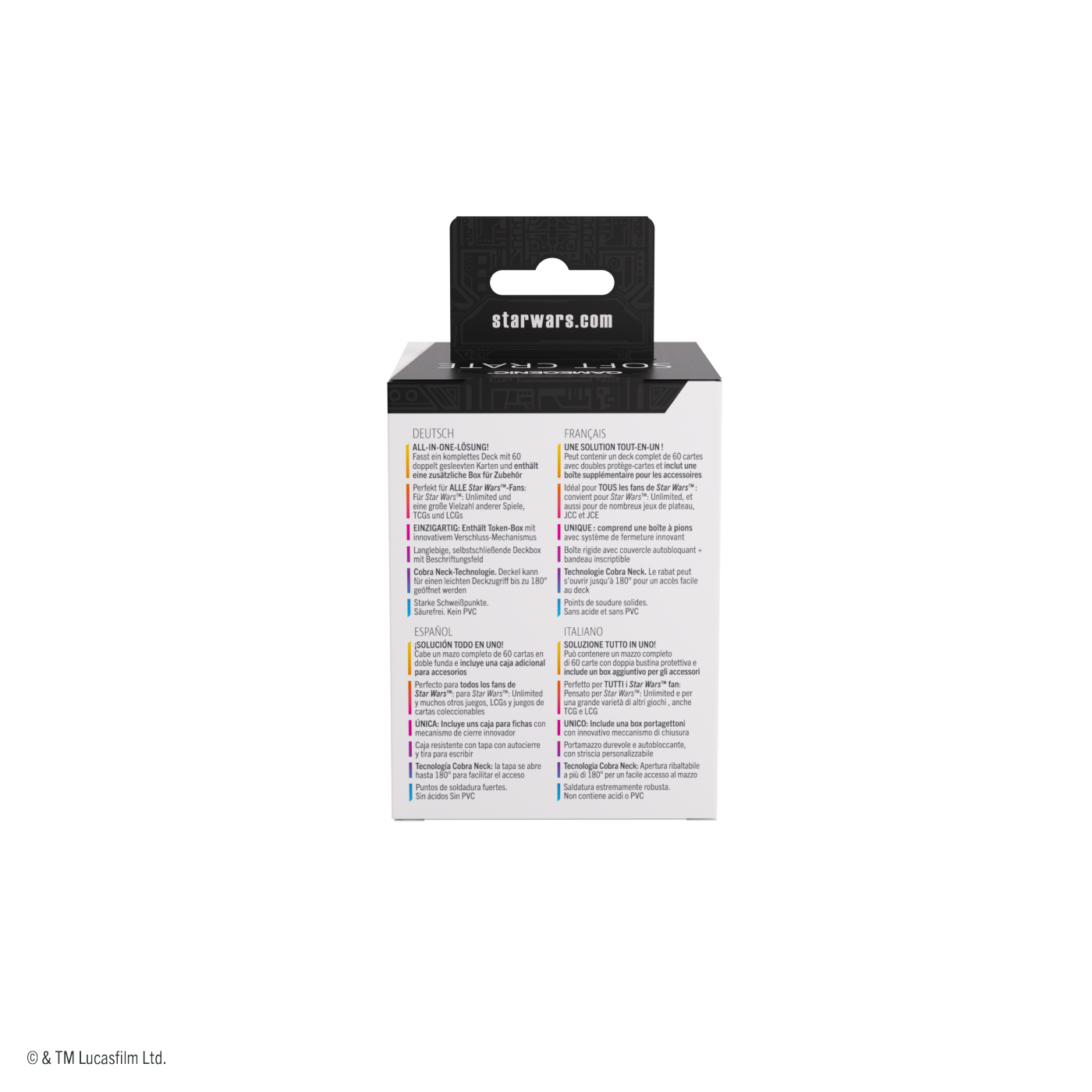 Pudełko składa się z dwóch komór, jedna przeznaczona jest na podwójnie zakoszulkowaną talię 60 kart, druga przechowa żetony i inne akcesoria. Pudełko jest także wyposażone w bezpieczny mechanizm zatrzaskowy, który chroni przed przypadkowym otwarciem, a jednocześnie umożliwia łatwy dostęp do talii. Każde pudełko dekoruje unikalna grafika, nawiązująca do bogatej historii uniwersum Gwiezdnych wojen.