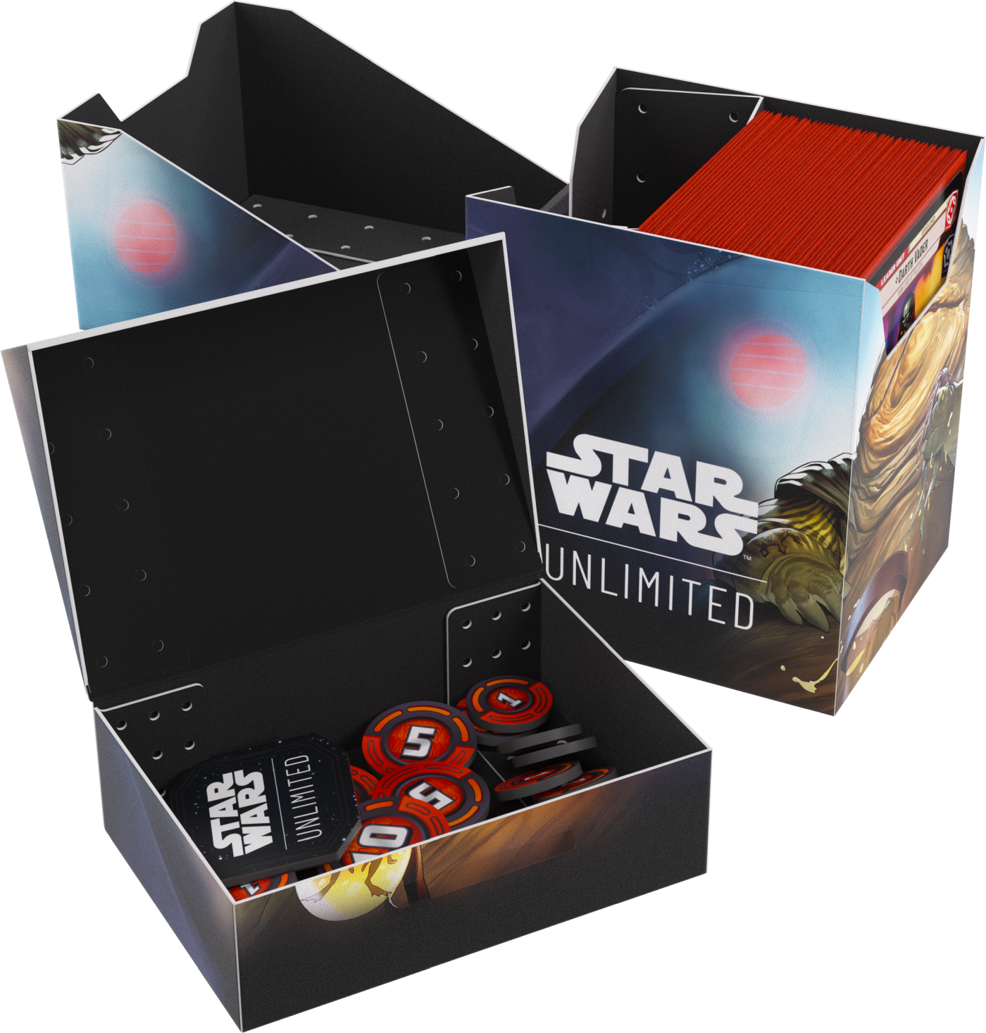 Pudełko składa się z dwóch komór, jedna przeznaczona jest na podwójnie zakoszulkowaną talię 60 kart, druga przechowa żetony i inne akcesoria. Pudełko jest także wyposażone w bezpieczny mechanizm zatrzaskowy, który chroni przed przypadkowym otwarciem, a jednocześnie umożliwia łatwy dostęp do talii. Każde pudełko dekoruje unikalna grafika, nawiązująca do bogatej historii uniwersum Gwiezdnych wojen.
