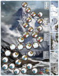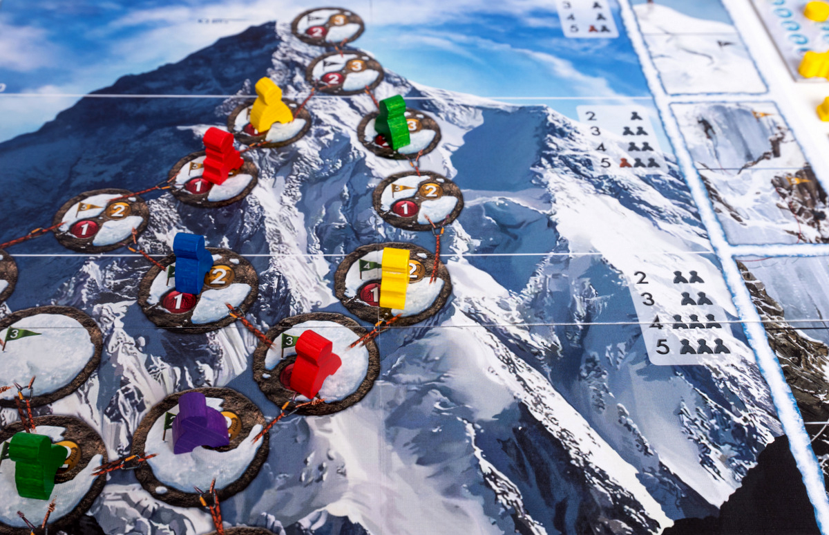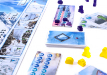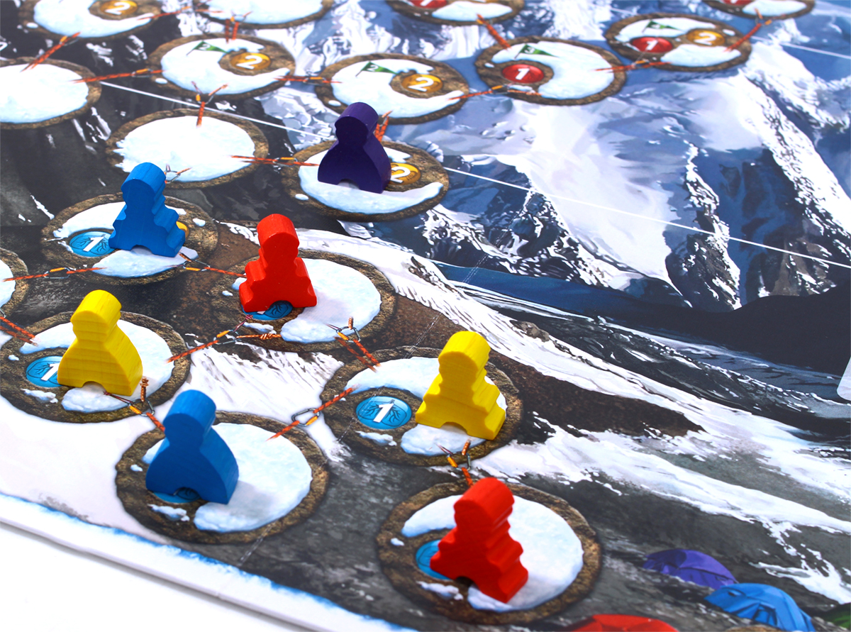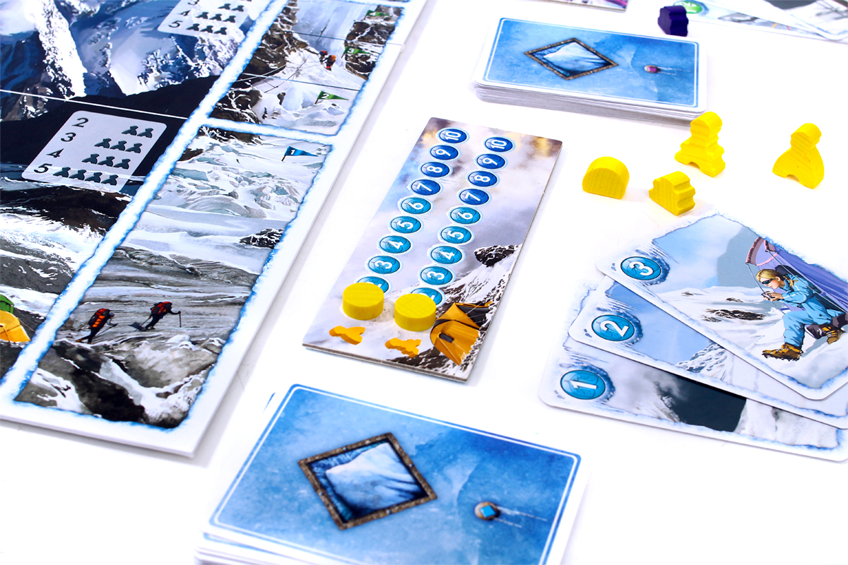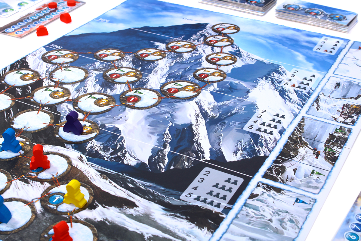 The box includes, among other materials, a double-sided board with two different routes to the summit (easier and harder) and two sets of weather tiles (for summer and winter).