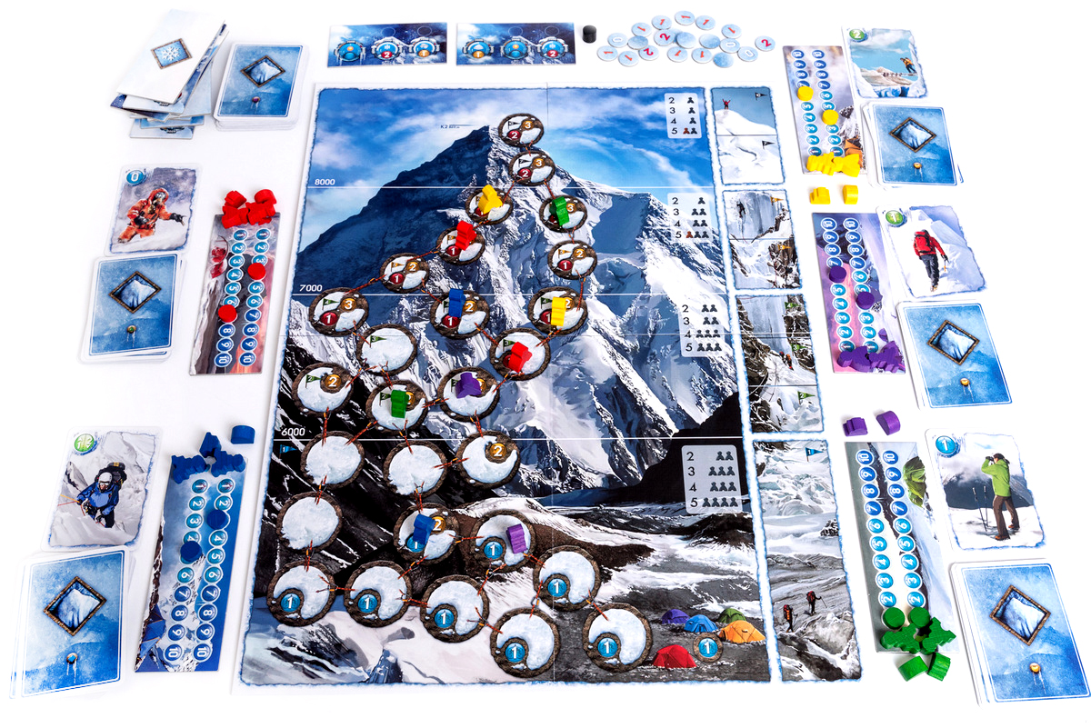 K2 is a hand management game for 1-5 players, with strong interaction and low luck factor, lasting up to 60 minutes. The theme is very well represented by the mechanics, including such elements as changing weather, lack of oxygen and death of the mountaineers. The result is an exciting match for gamers and non-gamers alike.