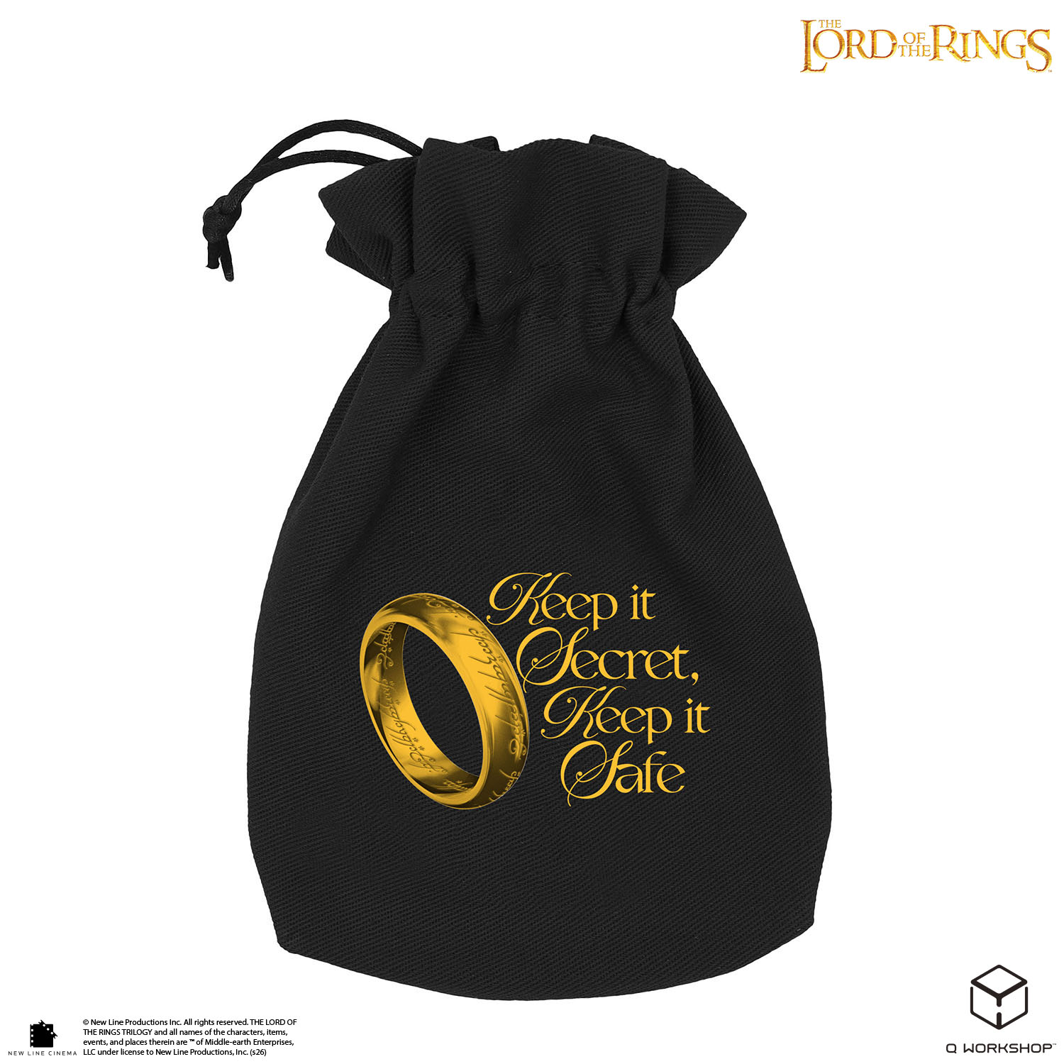 Przechowuj swoje kostki jak najpilniej strzeżony skarb! Mieszek Władca Pierścieni: Jedyny Pierścień - Keep It Secret pozwala na swobodne przechowywanie kości do gry i innych drobiazgów. Wykonany z wytrzymałej bawełny w kolorze czarnym i ozdobiony wyrazistą grafiką Jedynego Pierścienia oraz kultowym hasłem „Keep it Secret, Keep it Safe” stanowi praktyczny i stylowy dodatek, świetnie uzupełniający serię akcesoriów z motywami z Władcy Pierścieni.