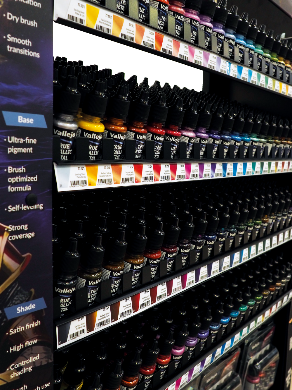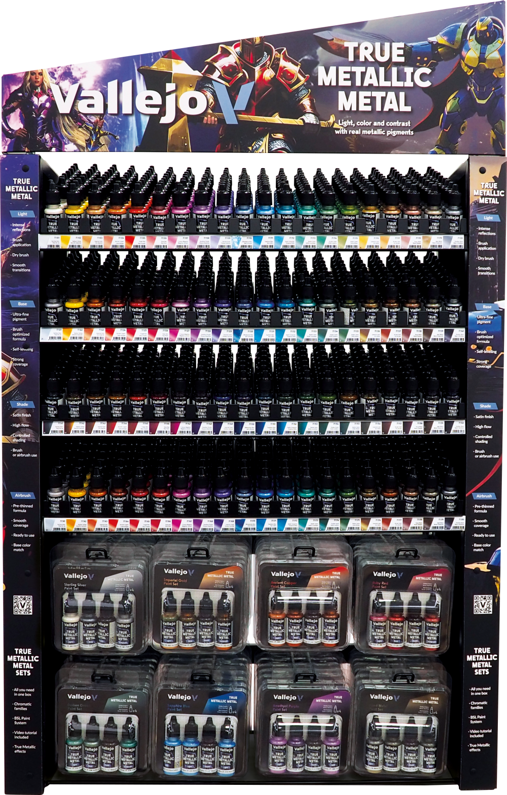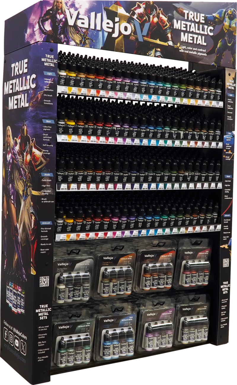 Regał zawiera pełną kolekcję farb Vallejo: True Metallic Metal. Znajdują się tu wszystkie kolory w pojedynczych buteleczkach (łącznie aż 80 wariantów), jak i 8 rodzajów gotowych zestawów.