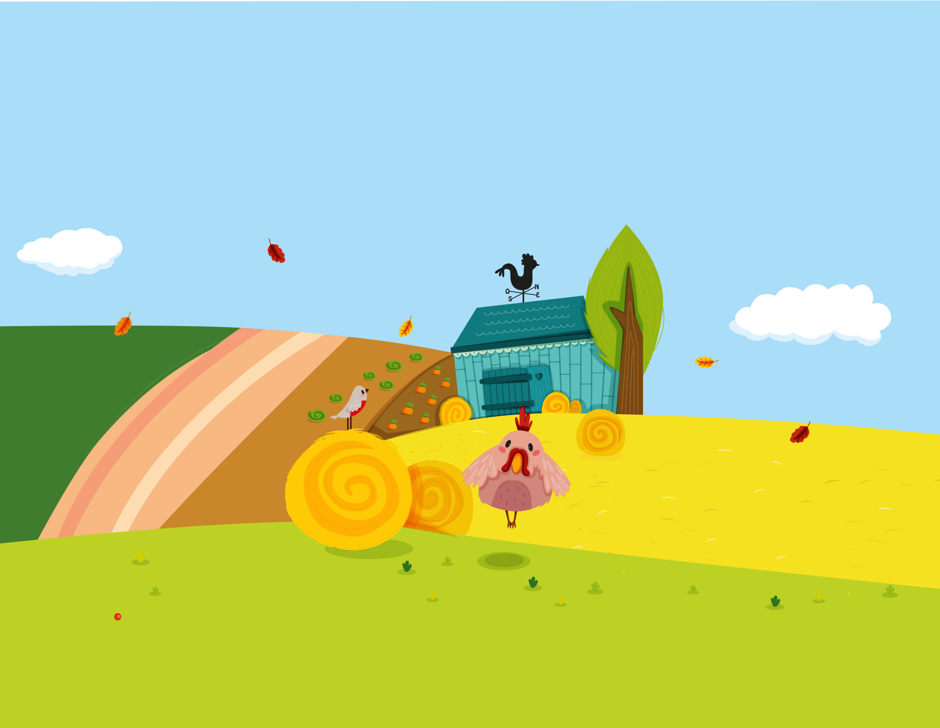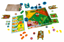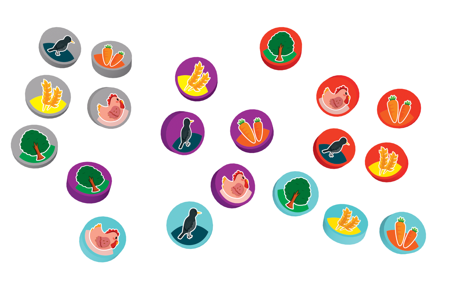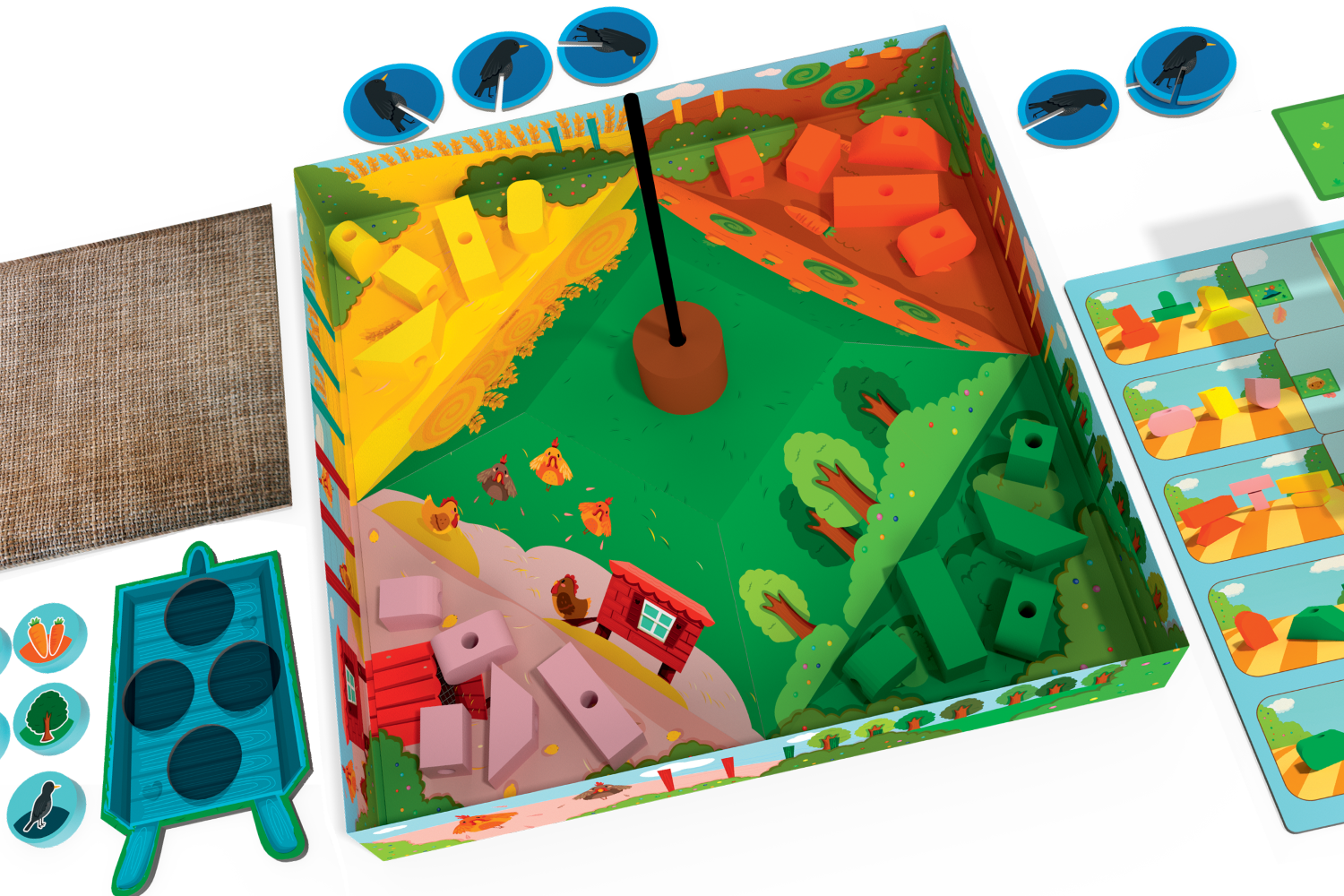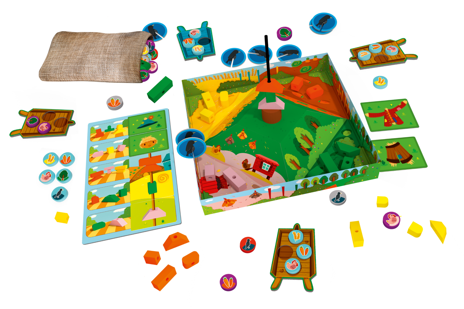 - Każdy z graczy otrzymuje własną planszetkę taczki oraz woreczek z 5 żetonami (wronę, drzewo, zboże, kurę oraz marchewkę).