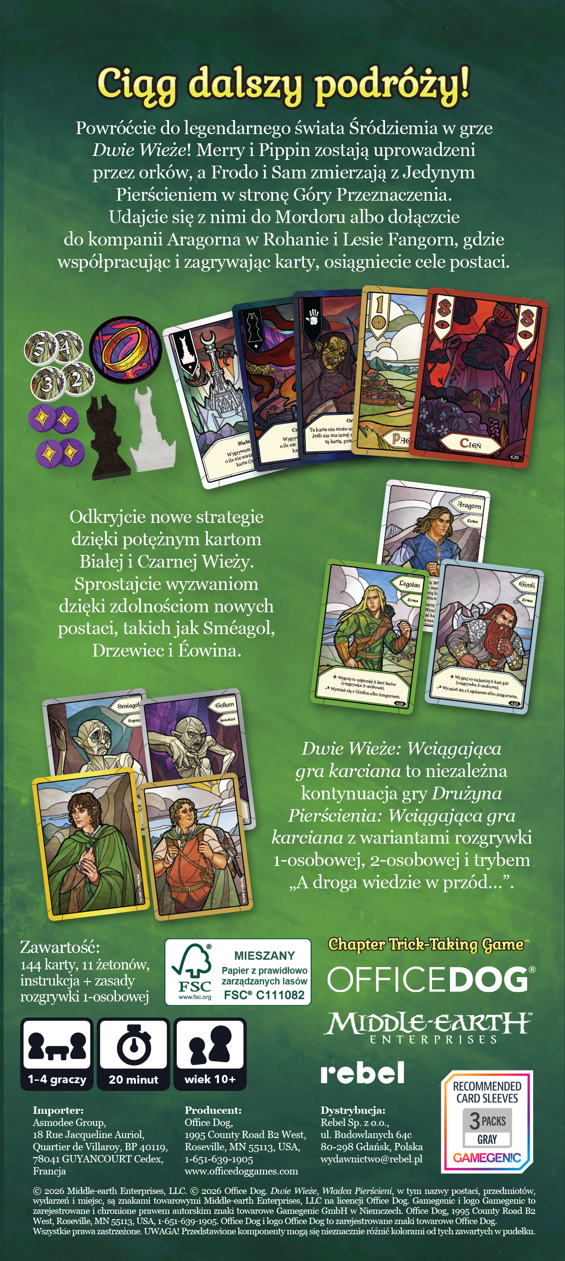 Władca Pierścieni: Dwie Wieże - Wciągająca gra karciana to kontynuacja popularnej gry opartej na zbieraniu lew, w której wspólnie wyznaczamy tory opowieści podczas wypełniania specjalnych misji. W 18 rozdziałach przedstawia ona drugą część klasycznej powieści autorstwa J.R.R. Tolkiena i pozwala na odkrywanie nowych strategii dzięki potężnym kartom Białej i Czarnej Wieży.